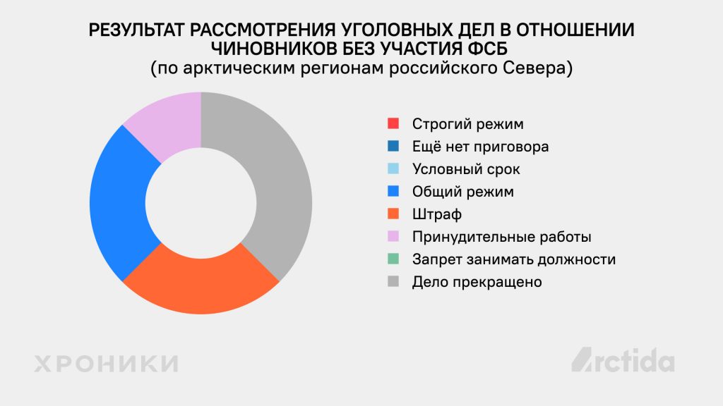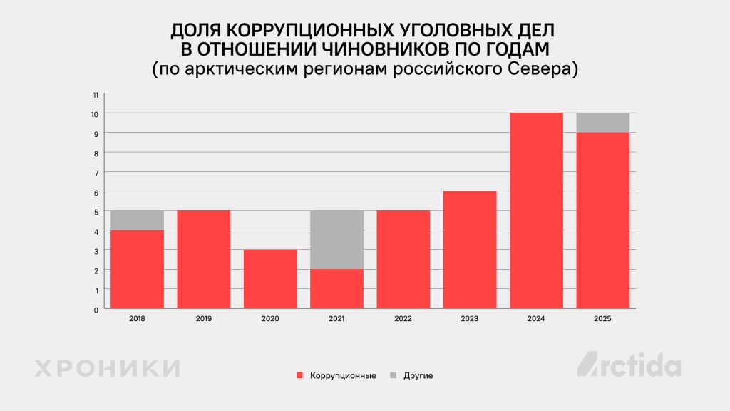 В арктических регионах рост количества преследований элит пока носит не столь системный характер, однако ужесточение репрессивного аппарата в целом по всей стране распространяется и на коррупционные дела против чиновников.