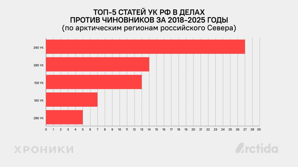 Среди пяти наиболее распространённых статей Уголовного кодекса в выборке исследования — ст. 290 (получение взятки), ст. 285 (злоупотребление должностными полномочиями), ст. 159 (мошенничество), ст. 160 (присвоение или растрата), ст. 286 (превышение должностных полномочий).