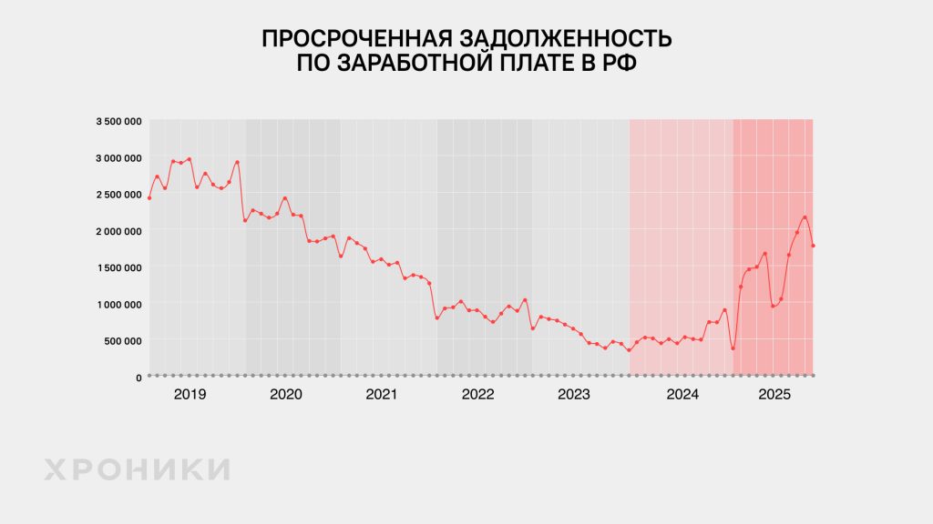 К концу 2025 года совокупная просроченная задолженность по зарплате по России приблизилась к 2 млрд рублей, в отдельные месяцы превышая эту сумму. Это в 2,5 раза больше, чем за год до этого!