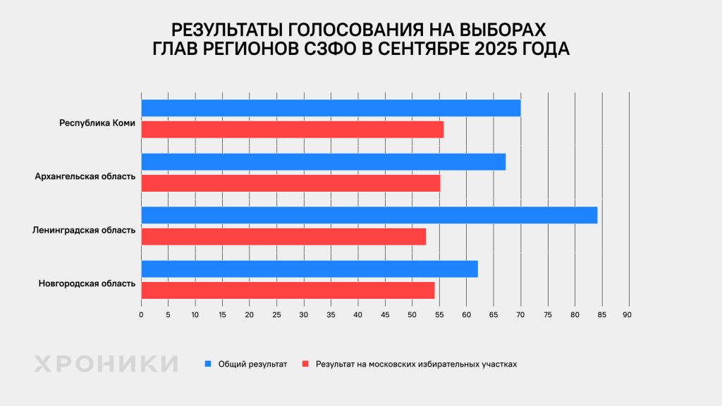 Региональные выборы 2025 года стали первыми, где массово голосовали не только по месту прописки, но и «на выезде»: в Москве и даже на фронте. В четырёх регионах северо-запада России — Архангельской, Ленинградской, Новгородской областях и в республике Коми — выбирали губернаторов, а в Коми еще и региональный парламент. По всей стране кампании прошли в 28 регионах — почти в трети всех субъектов федерации. Эксперимент с экстерриториальным голосованием показал, как власть будет строить выборы будущего.