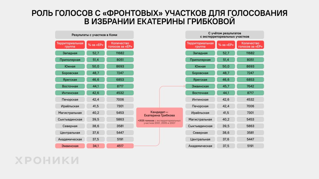 Все три участка на оккупированных территориях прикрепили к Эжвинской территориальной избирательной комиссии Коми. По списку «Единой России» от этой территории выдвигалась зампред регионального правительства, министр труда, занятости и социальной защиты Екатерина Грибкова.
