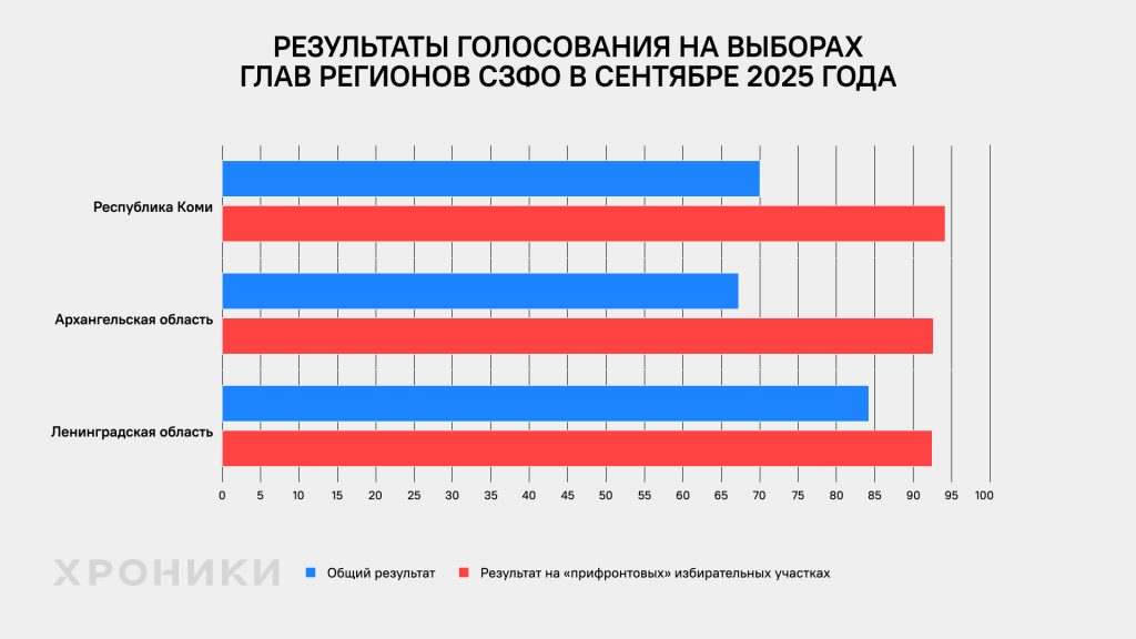 В республике Коми на выборах главы региона действующий губернатор Ростислав Гольдштейн набрал 70% голосов, а на трех прифронтовых участках — 94%. Существенно на итоговый результат Гольдштейна такая разница не повлияла, но позволила перешагнуть планку в 70%. На трех указанных участках Гольдштейн получил около 3,5 тысяч голосов из 163 тысяч (примерно 2%), полученных в целом в ходе голосования.