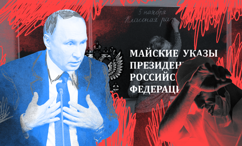 Президент России Владимир Путин обещал учителям зарплату на уровне 100% от средней по региону, врачам и преподавателям вузов — 200%. Эти обещания должны были исполниться к 2018 году, но не получилось. К середине 2024-го по России зарплата бюджетников составляла лишь 76,3% от целевых значений, на северо-западе страны — 82,7%. После этого про невыполненные обещания попросту забыли. «Хроники.Медиа» рассказывают, что случилось с самыми щедрыми обещаниями российских властей — «майскими указами» президента Путина.