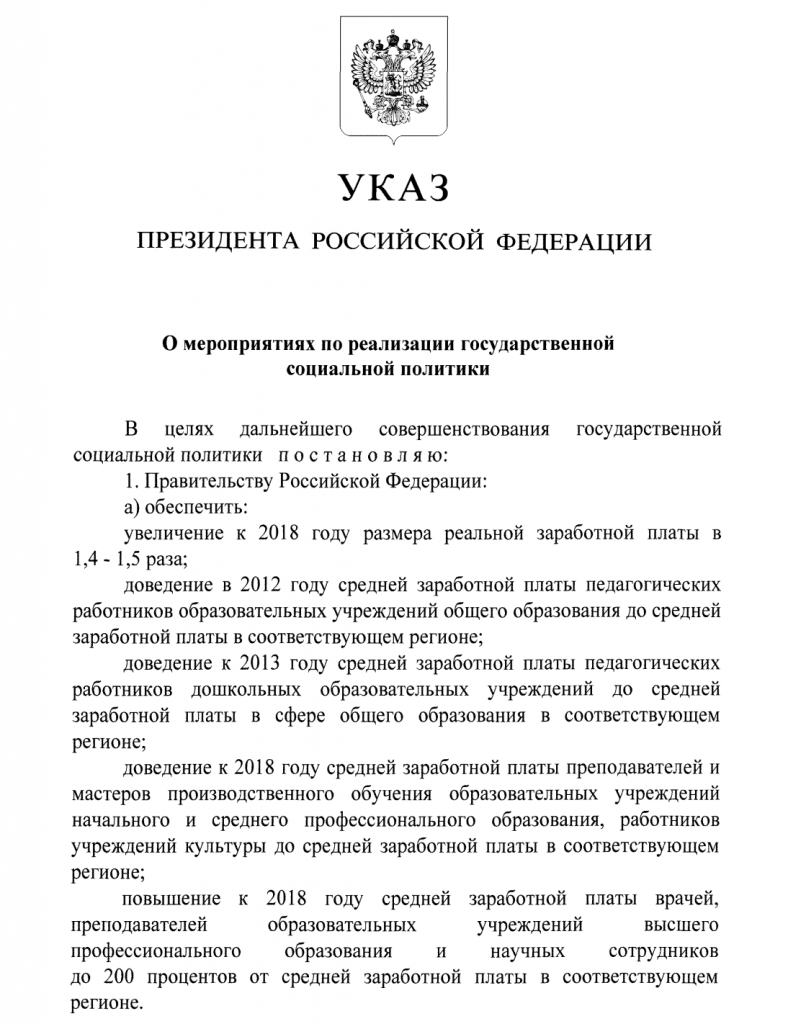В мае 2012 года, после избрания на третий президентский срок, Путин подписал целый ряд социально-экономических указов, прозванных «майскими». В числе прочего, они предусматривали повышение заработной платы разным категориям работников бюджетной сферы: учителям, врачам и медработникам, вузовским преподавателям и т.д.