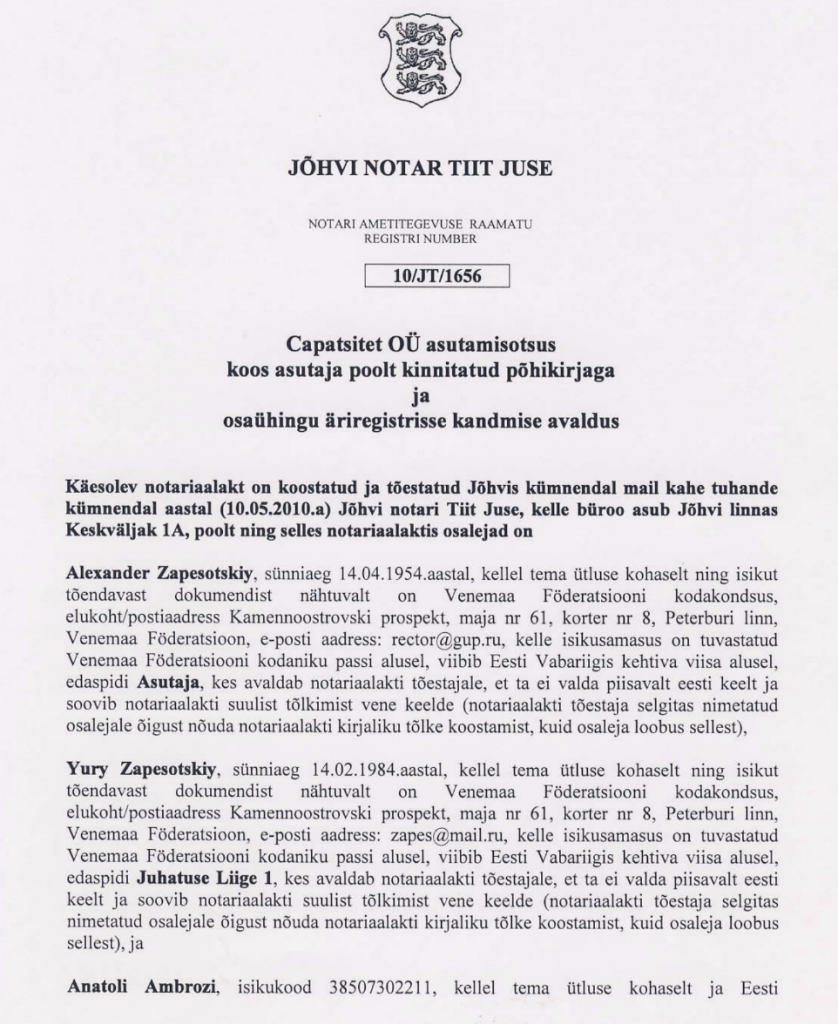 В 2010 году в Эстонии была зарегистрирована компания Capatsiten OU. Учредителем компании стал ректор Университета профсоюзов Александр Запесоцкий, его сын Юрий и эстонский риелтор Анатолий Амбрози вошли в правление.