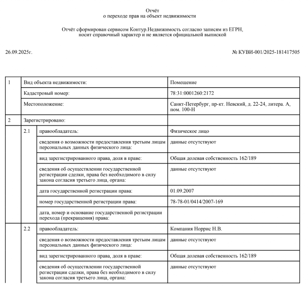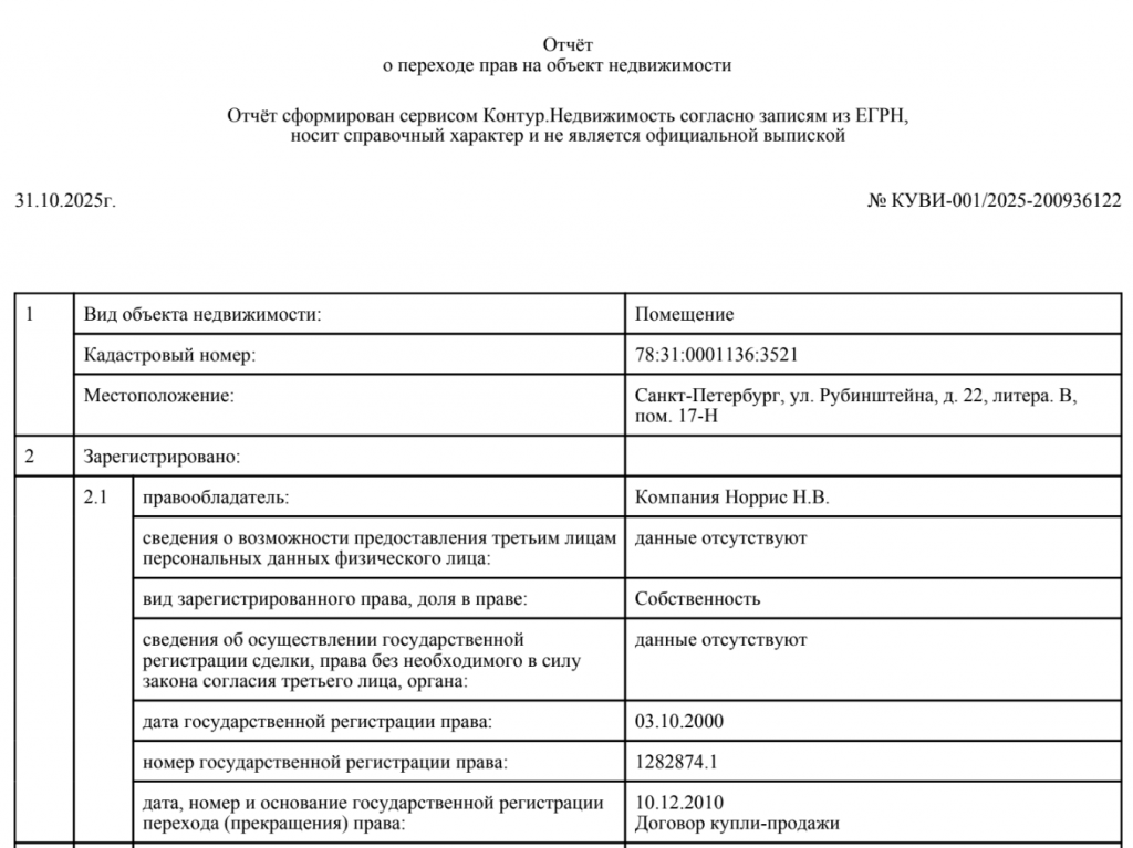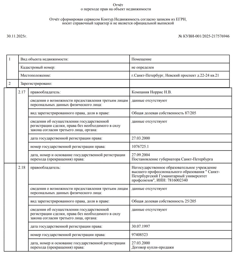 В 1997 году Гуманитарный университет профсоюзов зарегистрировал право собственности на долю в квартире площадью 285 кв. м на Невском, 22. В интернете можно найти информацию, что в 90-х годах по этому адресу располагался медицинский центр Гуманитарного университета профсоюзов. Через пару лет эта огромная квартира оказалась в собственности компании Norris N.V. В те же годы в собственности компании оказалось еще три квартиры общей площадью около 600 кв. м.