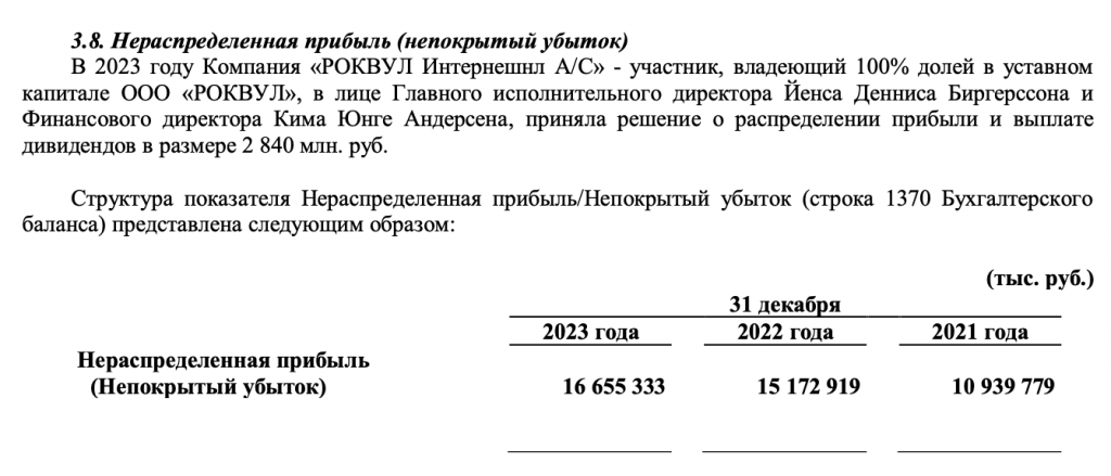 Как следует из отчетности подмосковной компании «Роквул», в 2023 году исполнительный директор Rockwool International, которая является учредителем для российской части группы Rockwool, Йенс Деннис Биргерссон и финансовый директор Ким Юнге Андерсен приняли решение о распределении прибыли российского юрлица и выплате дивидендов в размере 2,84 млрд рублей (28,6 млн евро). В 2024 году было принято решение о выплате дивидендов в размере 90 млн рублей (0,9 млн евро).