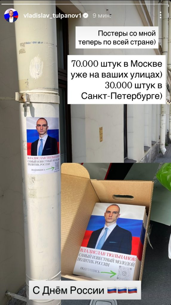 Тем же летом в Петербурге и Москве расклеили плакаты с фотографией Тюльпанова и подписью «Самый известный молодой политик России» и QR-кодом, ведущим на его страницу в Instagram. По словам Тюльпанова, в Петербурге появилось 30 тысяч таких плакатов, а в Москве — 70 тысяч. Цель — «напомнить о себе». Также Тюльпанов публиковал постановочные видео со словами поддержки от подростков, которые на фоне его листовок говорят, что проголосуют только за него, желают удачи и всего наилучшего.