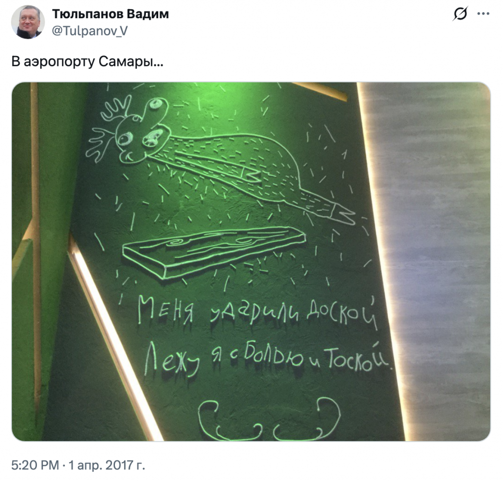 В 2017 году Вадим Тюльпанов умер. За три дня до смерти он опубликовал пророческий пост в Twitter — фотографию с надписью «Меня ударили доской, лежу я с болью и тоской».